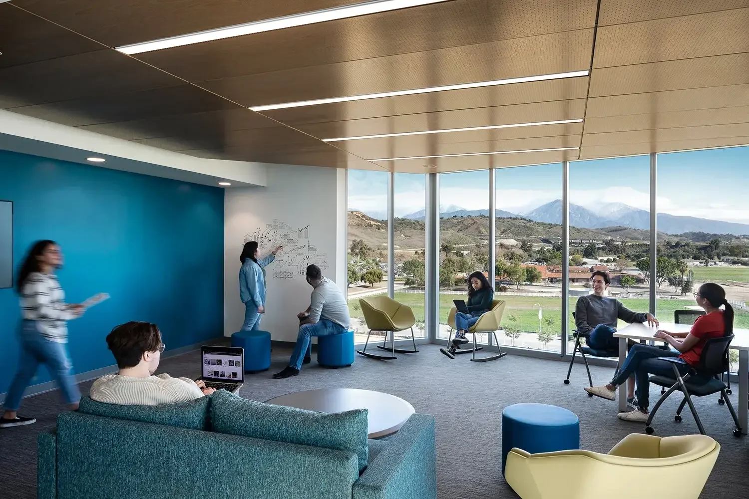 Inside the two student housing buildings behind the Dining Commons, there are dedicated gathering spaces on every floor. Some areas are more private for quiet study, while others stimulate student engagement and interaction. Giant wall boards are provided for students to collect and organize their thoughts, and work out presentations.