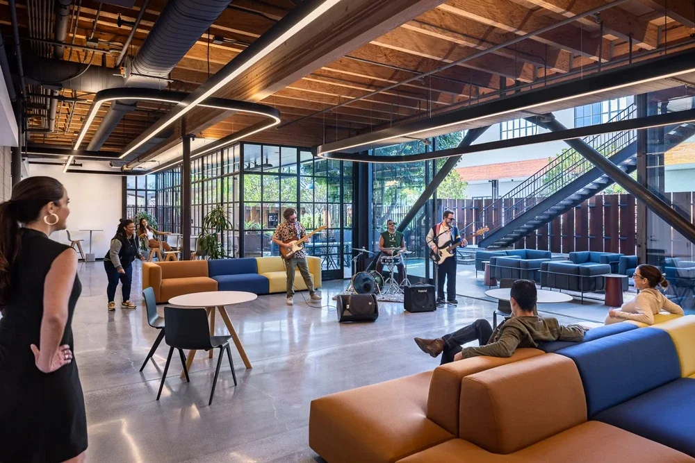 Lawrence Anderson Studio booked a band for a photo shoot? That was a first for me! Universal Music Publishing Group in Santa Monica, designed by Gensler, is all about bringing people back to the office with a bang – literally. Live bands play every Thursday. We crammed a two-day photo and video shoot into one high-energy day, capturing everything from architectural photography to behind-the-scenes action and executive portraits. And we had a blast doing it!